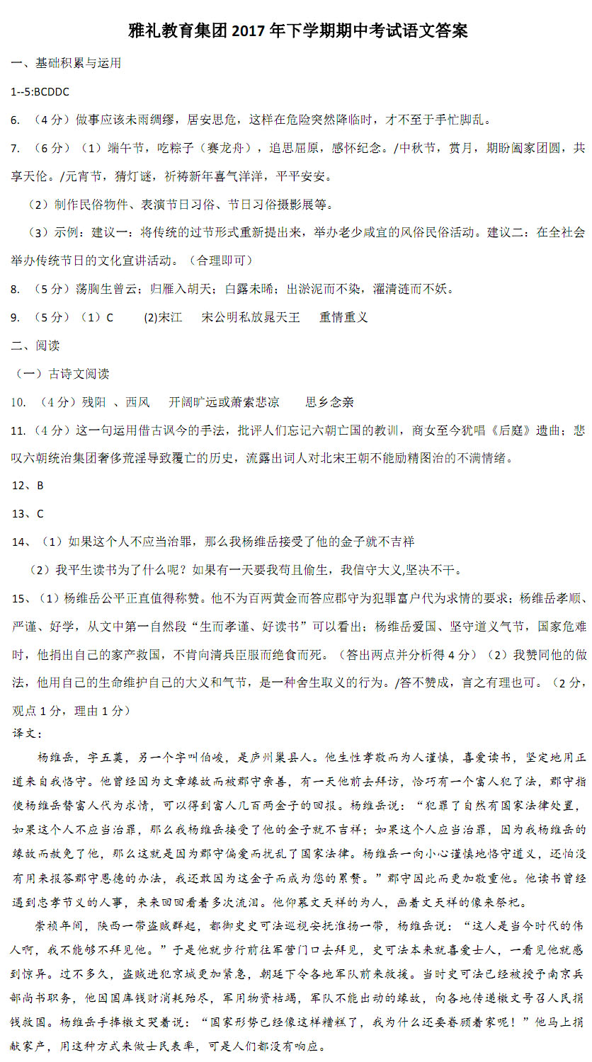 2017年秋季雅礼集团初三期中十五校联考语文答案