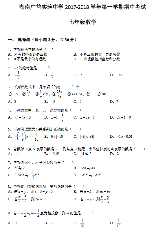 2017年秋季长沙广益中学初一期中考试数学试卷(下载版)