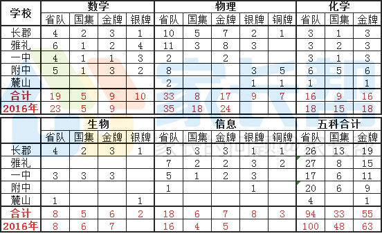那么,在湖南省内各校的获奖情况如何?下表为2017五大学科竞赛湖南省各学校获奖情况一览: