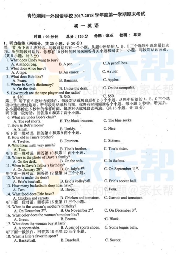 2017-2018学年青竹湖湘一初一上英语期末试题