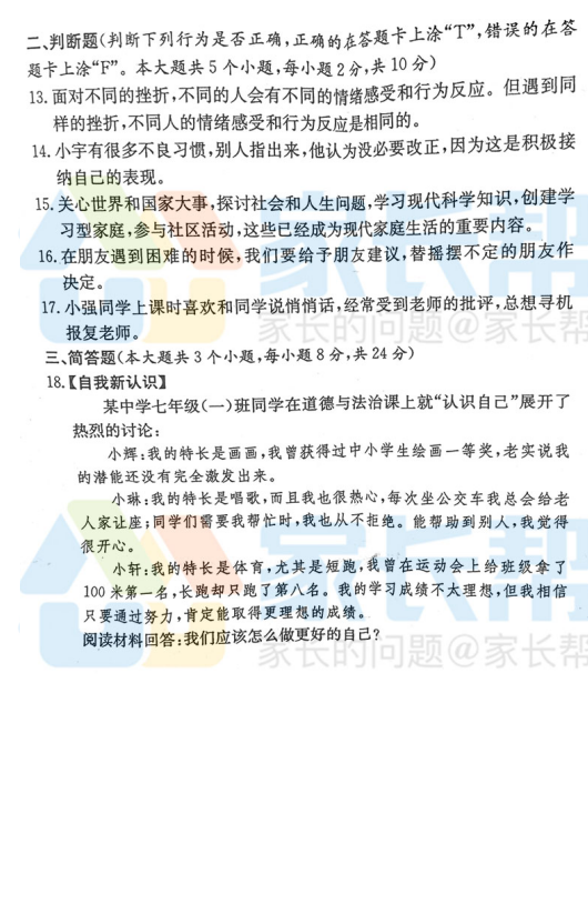2017-2018学年长郡集团初一上期末政治试题(4)