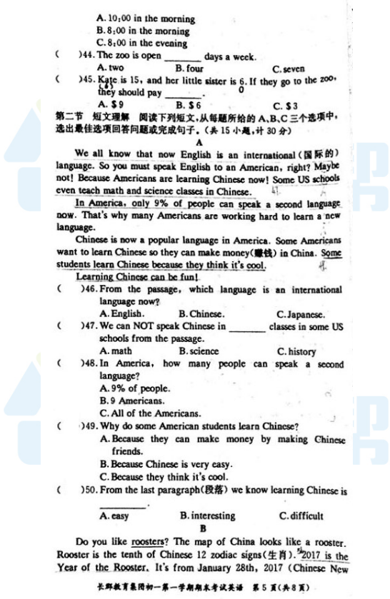 2017-2018学年长郡集团初一上期末英语试题(5)
