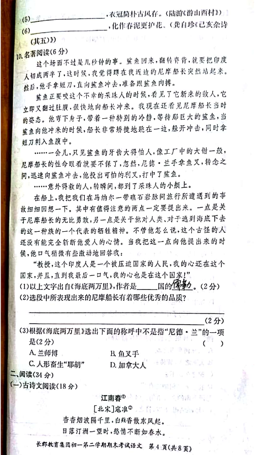 2018年长郡集团七年级下期末考试语文试卷(4)